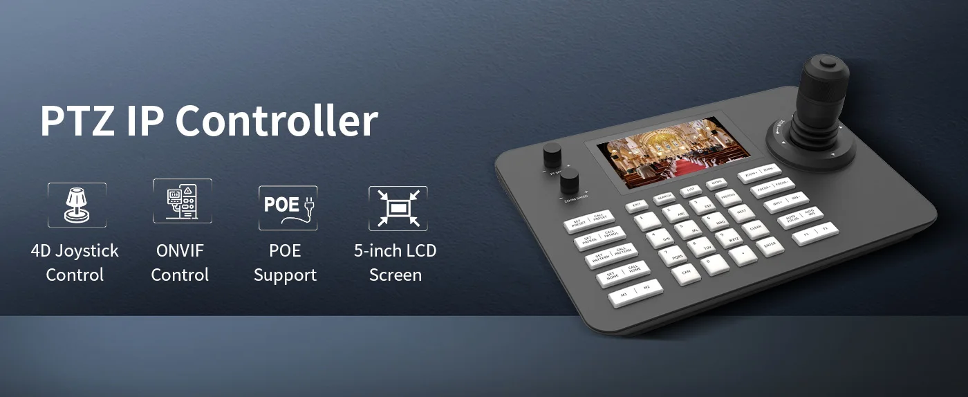 PTZ Controller 5 Inch LCD Screen Decoding H.264 and H.265 Network Support POE Support ON VIF 4D Joystick Decoding Keyboard