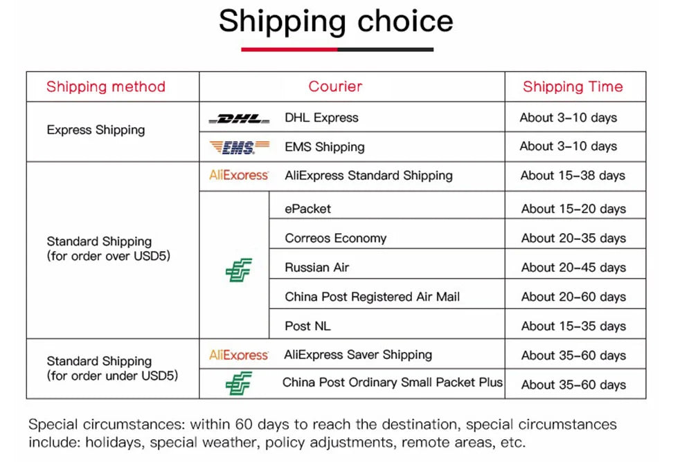 - Shipping Methods: We use trusted carriers such as FedEx, DHL, and USPS to ensure timely delivery.