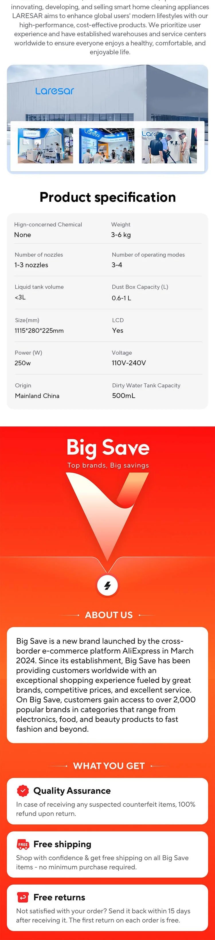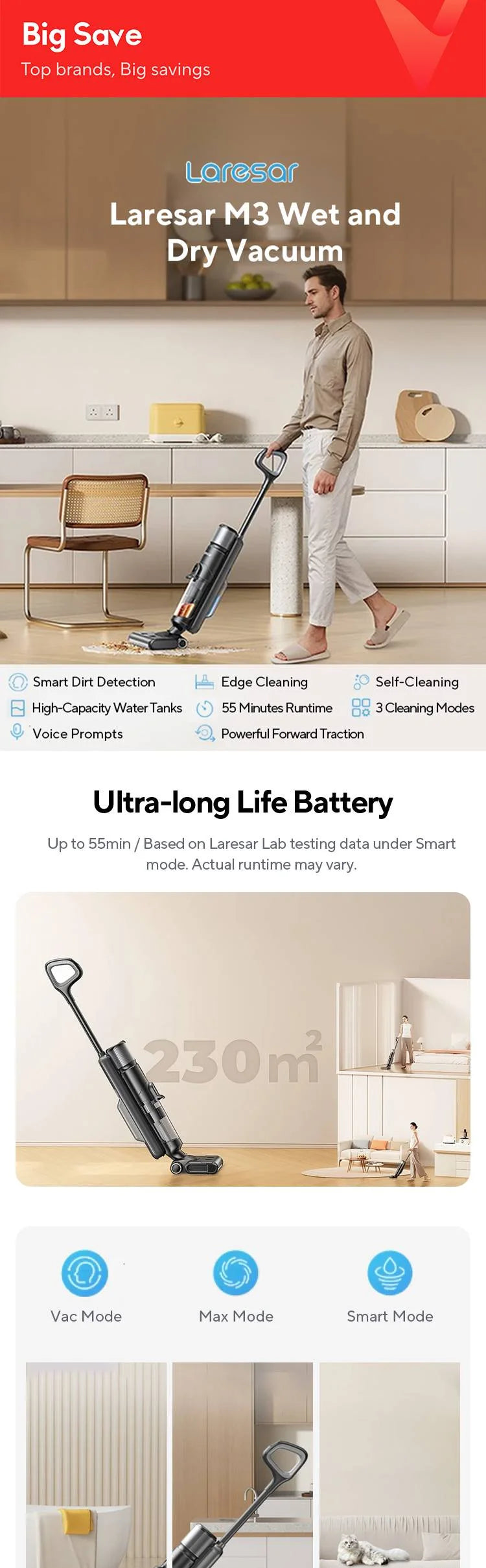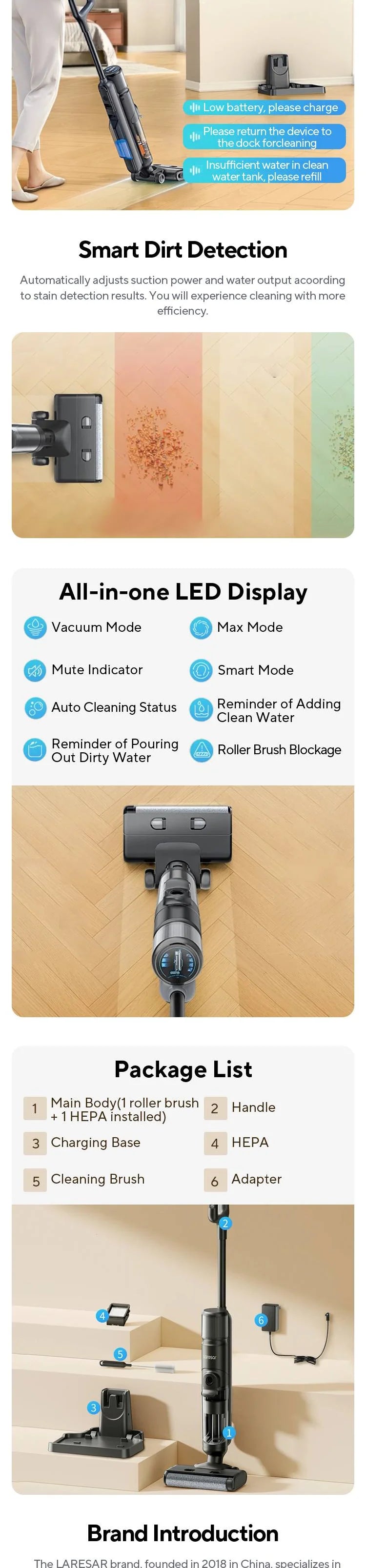 Laresar M3 Cordless Wet Dry Vacuum Cleaner Mop, Edge Cleaning 55min Auto Suction Floor Washer Self-Cleaning Smart Home Appliance