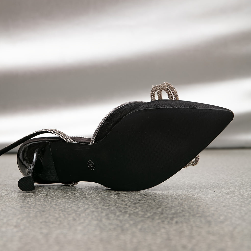 Women's Rhinestone Bow Ankle Straps High Heels, Solid Color Slingback Pointed Toe Pumps, Wedding Dress Heels for Music Festival