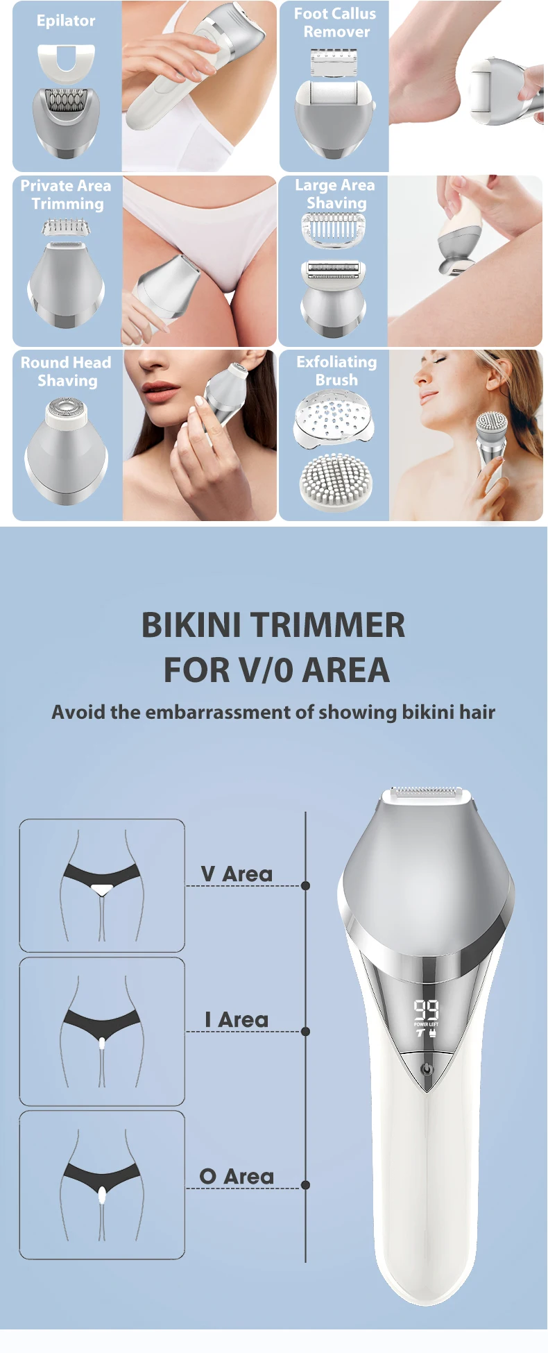 - 7-in-1 Versatility: This women's body hair trimmer comes with 7 different heads for various grooming needs, including massage, hair removal, foot filing, private area trimming, large area shaving, circular shaving, and exfoliation.