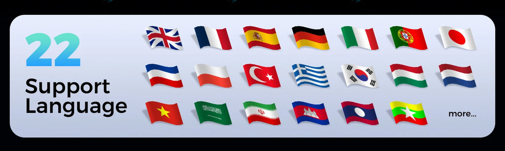 English, French, Spanish, German, Italian, Portuguese, Japanese, Russian, Polish, Traditional Chinese, Turkish, Greek, Korean, Hungarian, Dutch, Vietnamese, Arabic, Persian, Khmer, Lao, Burmese, Thai