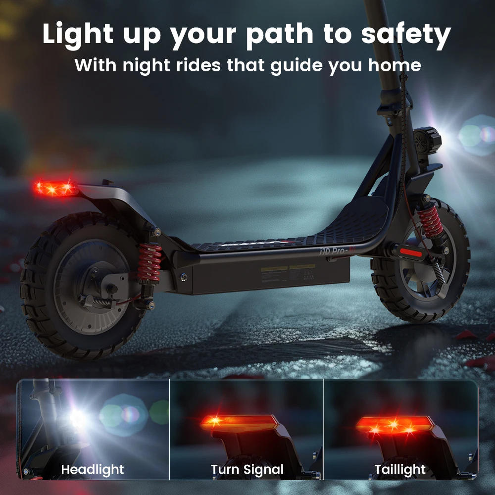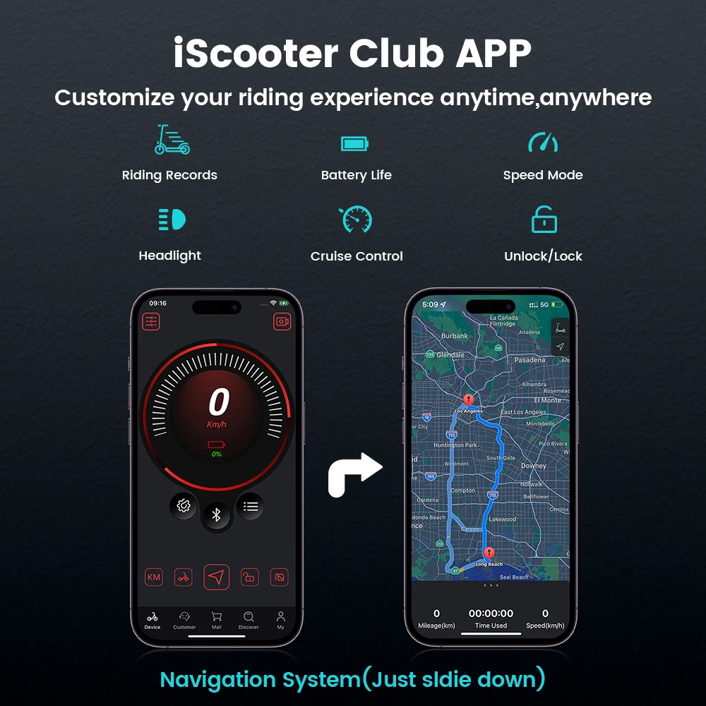 The i10Pro includes both front and rear hub brakes, along with a hidden electronic brake for enhanced safety. It supports a maximum weight of 120 kg and offers a range of 50-60 km. The scooter is equipped with front and rear spring suspension for a smooth ride and includes a 54.6V2A charger with plug and a custom black waterproof leather bag. The iScooter app provides added control and connectivity.