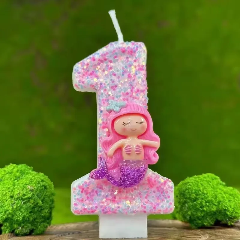 Sanrio Handmade DIY1pc Number 0-9 Pink cartoon mermaid Digital Candles with Sequins Suitable for Birthday Party Cake Decoration