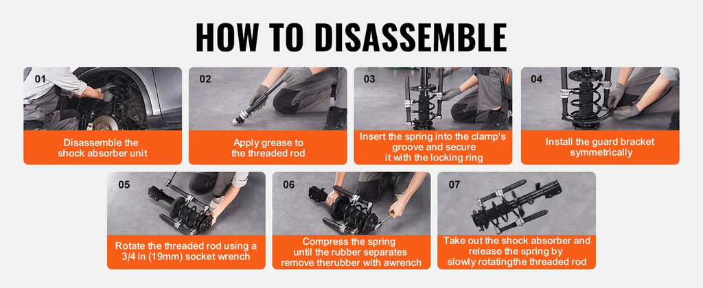 Compatible with 3/4" Socket: The compressive stroke is 11 inches / 280 mm. You can use a socket to compress the hex bolt at the bottom of the threaded rod. Note: 1. Apply grease lubrication to the threaded rod before operation. 2. Compress and release the spring alternately on both sides to maintain consistent compression length. 3. Use both hands during compression; impact wrenches are not recommended.