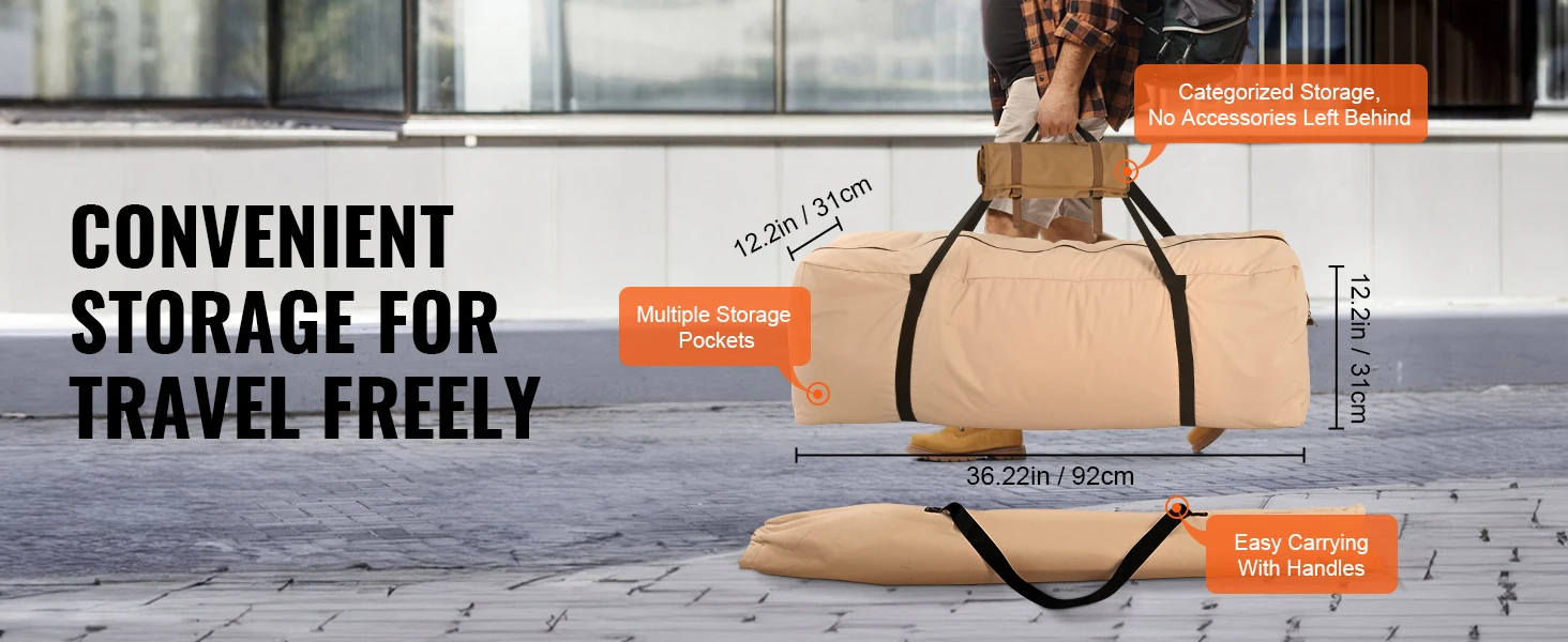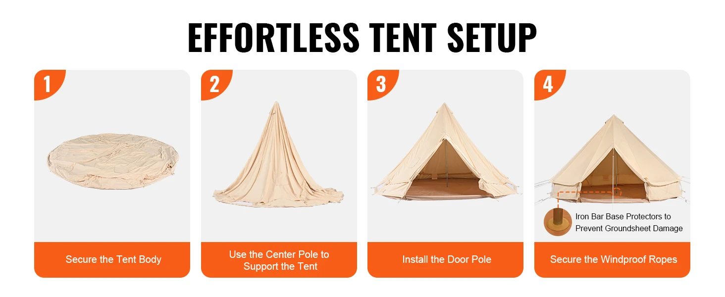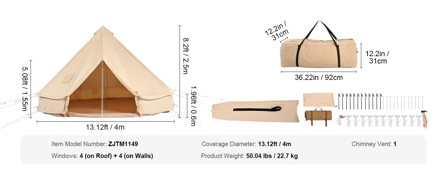 Durable Materials: Crafted with TC technology cotton, our canvas bell tent boasts durability and breathability, reducing condensation inside and ensuring comfort in all weather conditions. Sturdy galvanized iron center and door poles ensure stability.