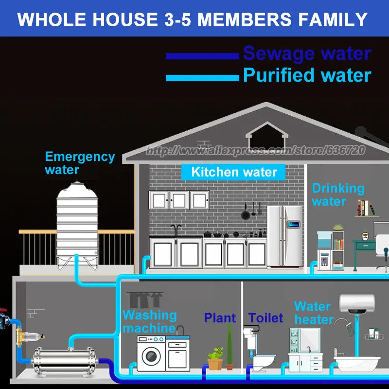 it is 600/1000/2000/3000 L/H output ,enough for whole house water demand , 0.01 micron filtration and be designed of drain out from blow down valve, it can be used for whole house water filter, purified water reach drinkable requirement source of municipal water. protect the appliance and water pipes in house.
