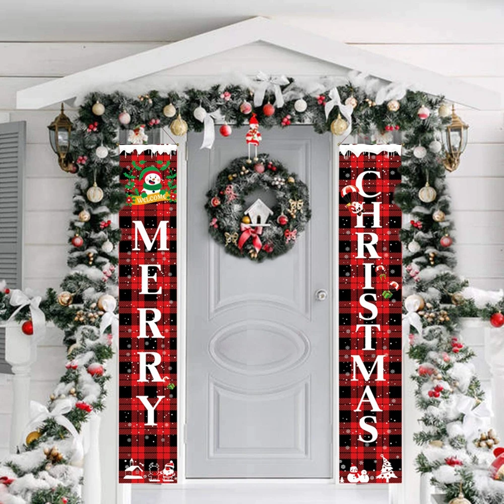Christmas Decorations Outdoor Yard Front Porch Sign Set Red Black Buffalo Plaid Door Banner Hanging Merry Christmas Decorations