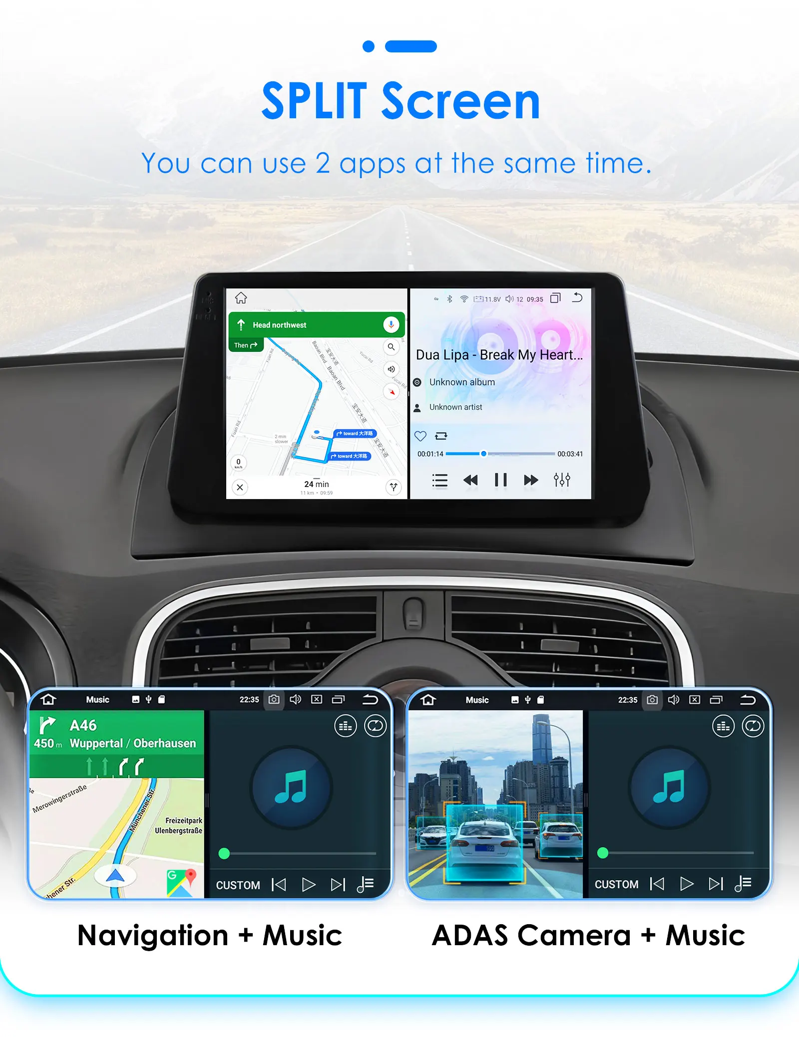 Support split screen display of any 2 applications, combining at will.