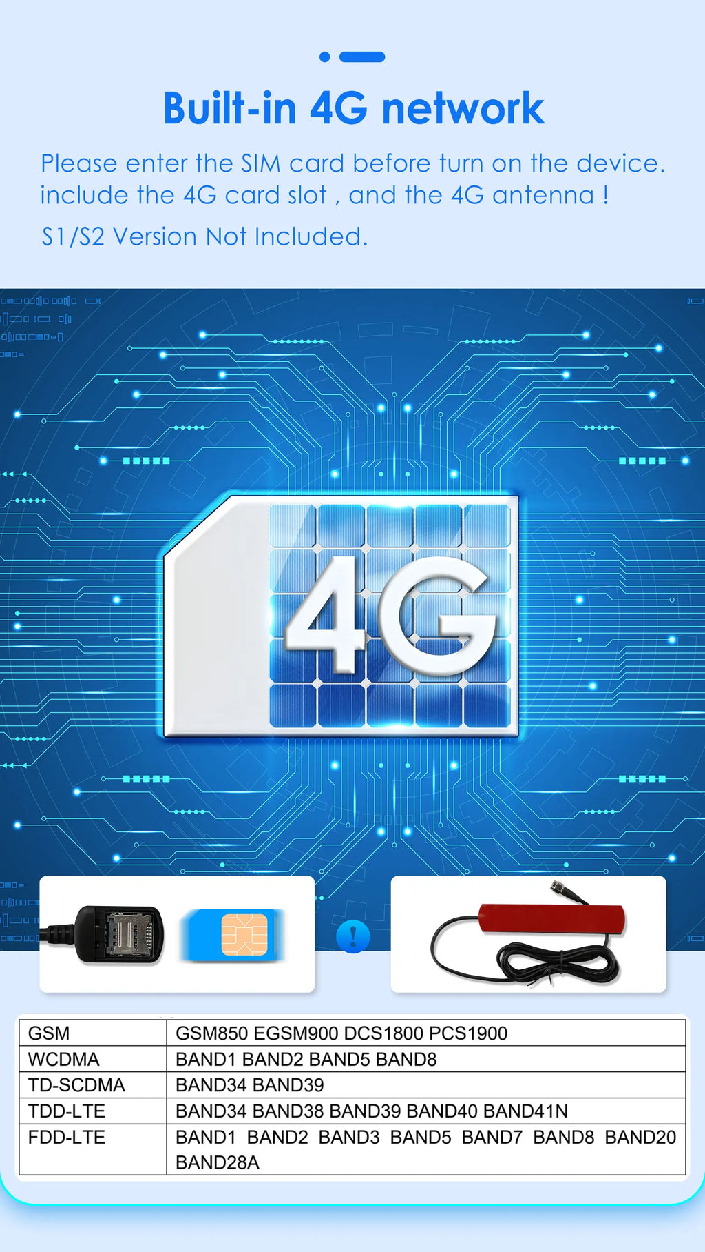 S3/S4/S5/S6/S7/S8 supports 4G and WIFI. The package contains a SIM card slot.