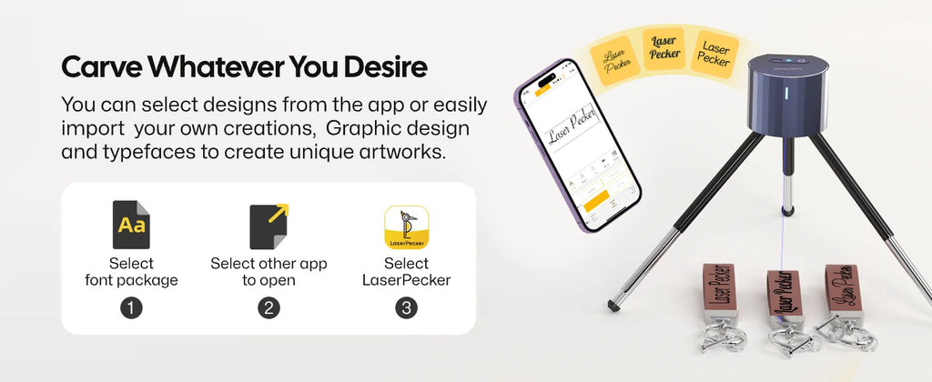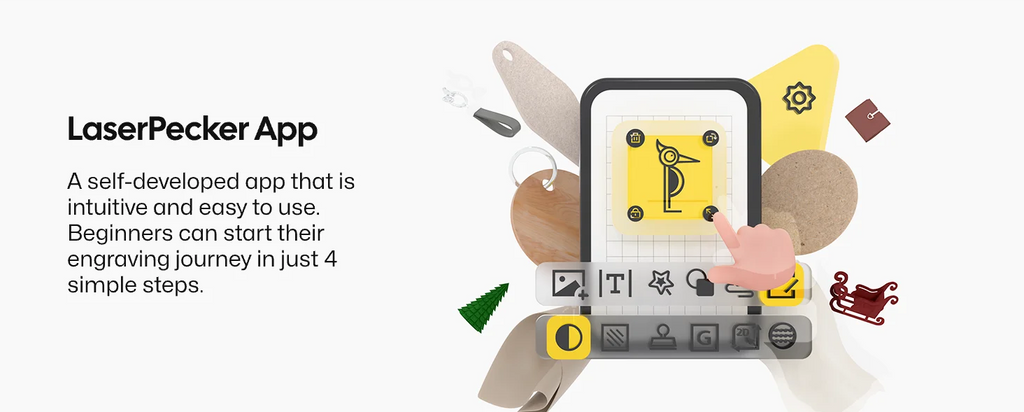 3:3-Step Wood Engraving - No Experience Needed: ① Bluetooth connect ② Set 20cm height ③ Upload designs. Create custom wooden tags/plaques in 4x4" area - 5x faster setup than similar tools.