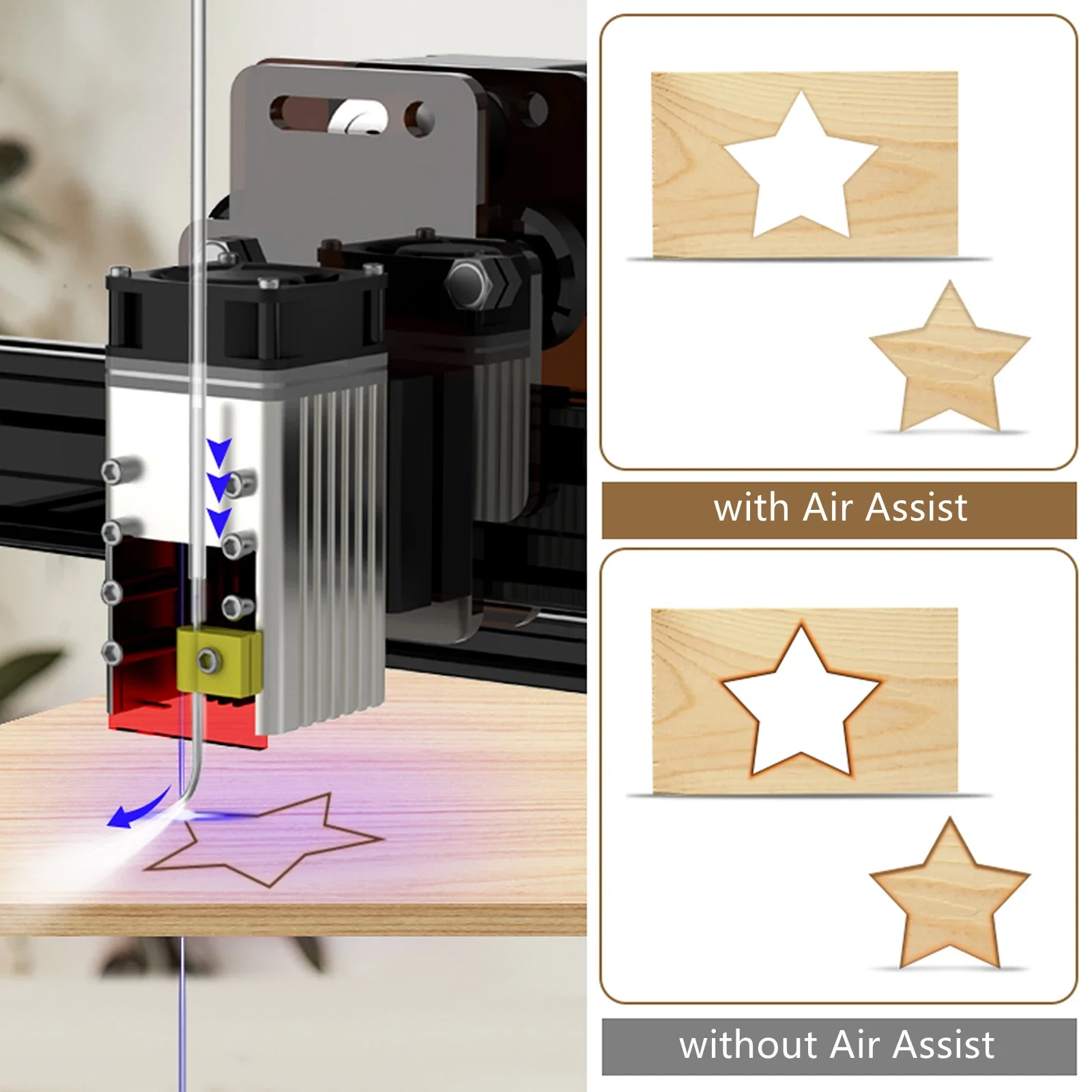The laser engraver is equipped with an air-assist system that generates a strong and stable airflow when engraving wood and metal, effectively removing smoke and debris generated during the work. This not only improves the efficiency of the laser, but also dramatically reduces the processing time, allowing you to do more work with less effort.