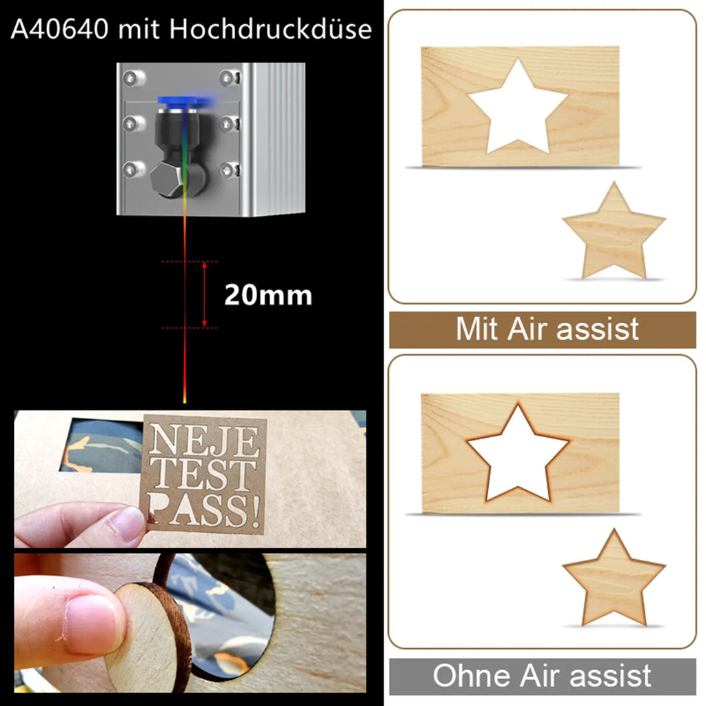 The air assist system is compatible with NEJE laser engraving machines and is easy to install. Note that this product only supports the European version with 220-240 volts. For use in the United States, an additional 110 volt AC-60Hz power supply is required.