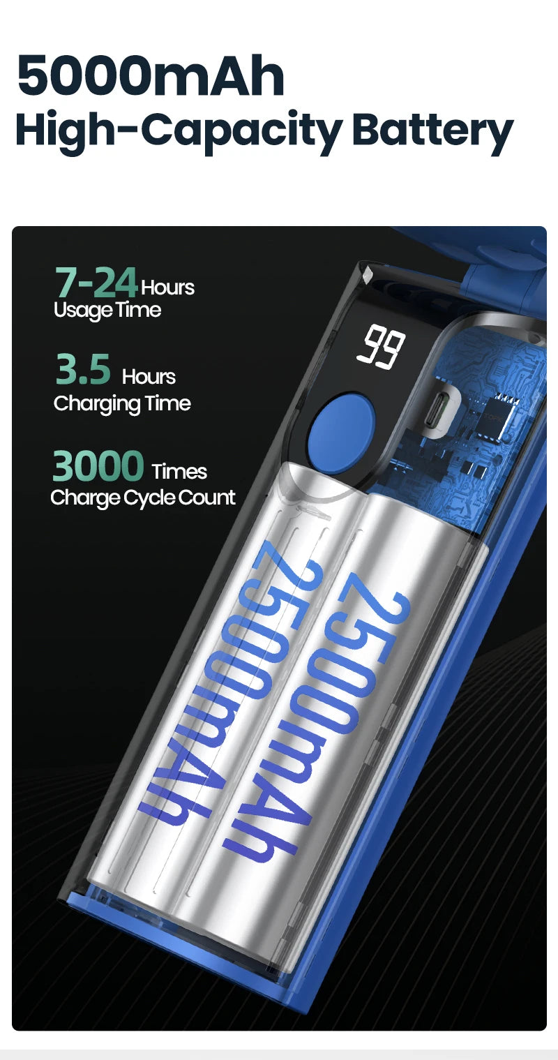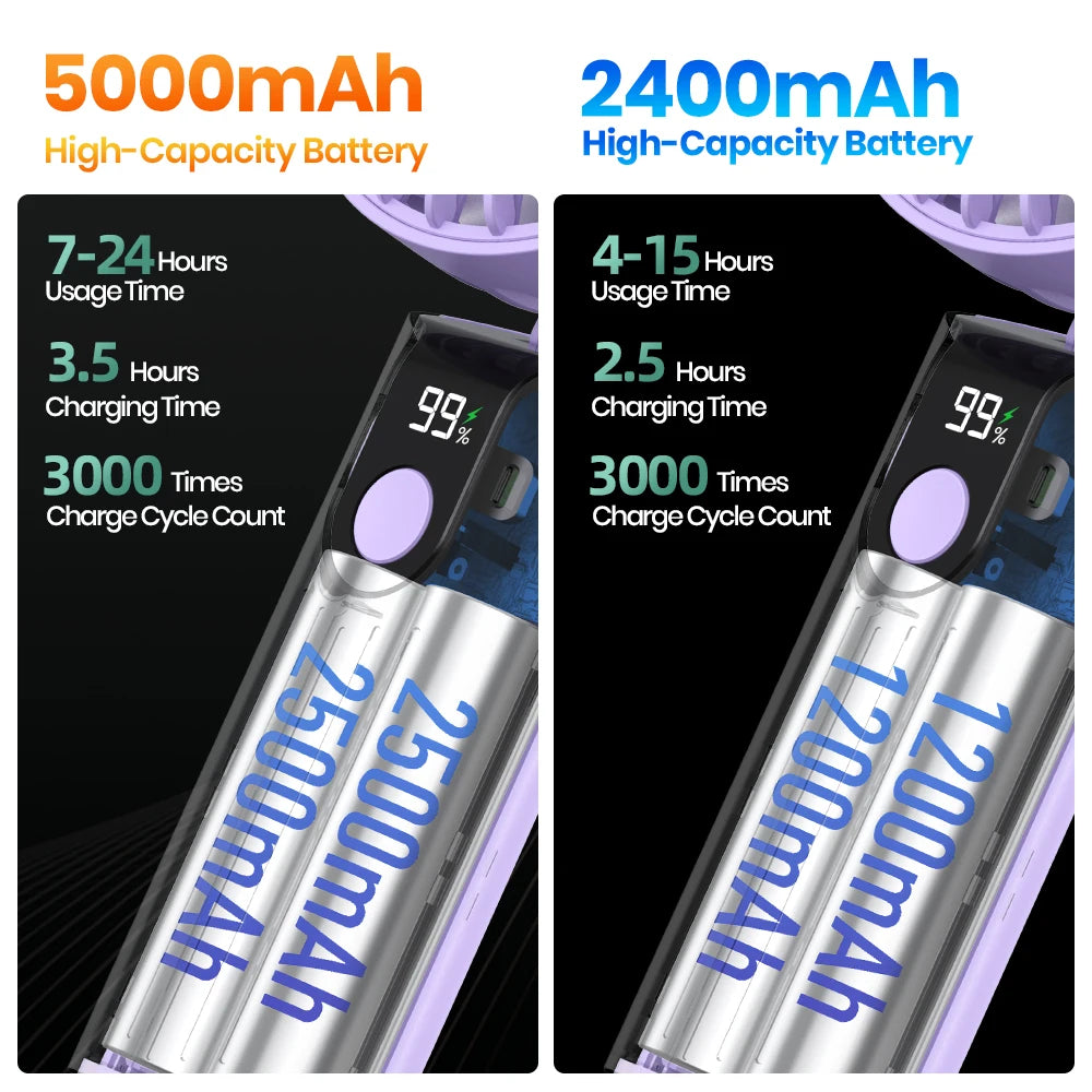 【USB Rechargeable】The portable handheld fan has a built-in 2400mAh / 5000mAh large-capacity rechargeable battery, and you can use any USB device to charge the mini handheld fan at any time.