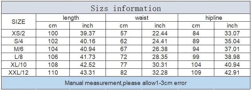 size_info: {"sizeInfoList":[{"length":{"cm":"84","inch":"33.07"},"size":"XS-2","vid":-1},{"length":{"cm":"89","inch":"35.04"},"size":"S-4","vid":-2},{"length":{"cm":"94","inch":"37.01"},"size":"M-6","vid":-3},{"length":{"cm":"99","inch":"38.98"},"size":"L-8","vid":-4},{"length":{"cm":"104","inch":"40.94"},"size":"XL-10","vid":-5},{"length":{"cm":"109","inch":"42.91"},"size":"XXL-12","vid":-6}]}