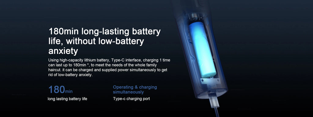 Using high-capacity lithium battery, Type-C interface, charging 1 time can last up to 180min *, to meet the needs of the whole family haircut. it can be charged and supplied power simultaneously to get rid of low-battery anxiety.